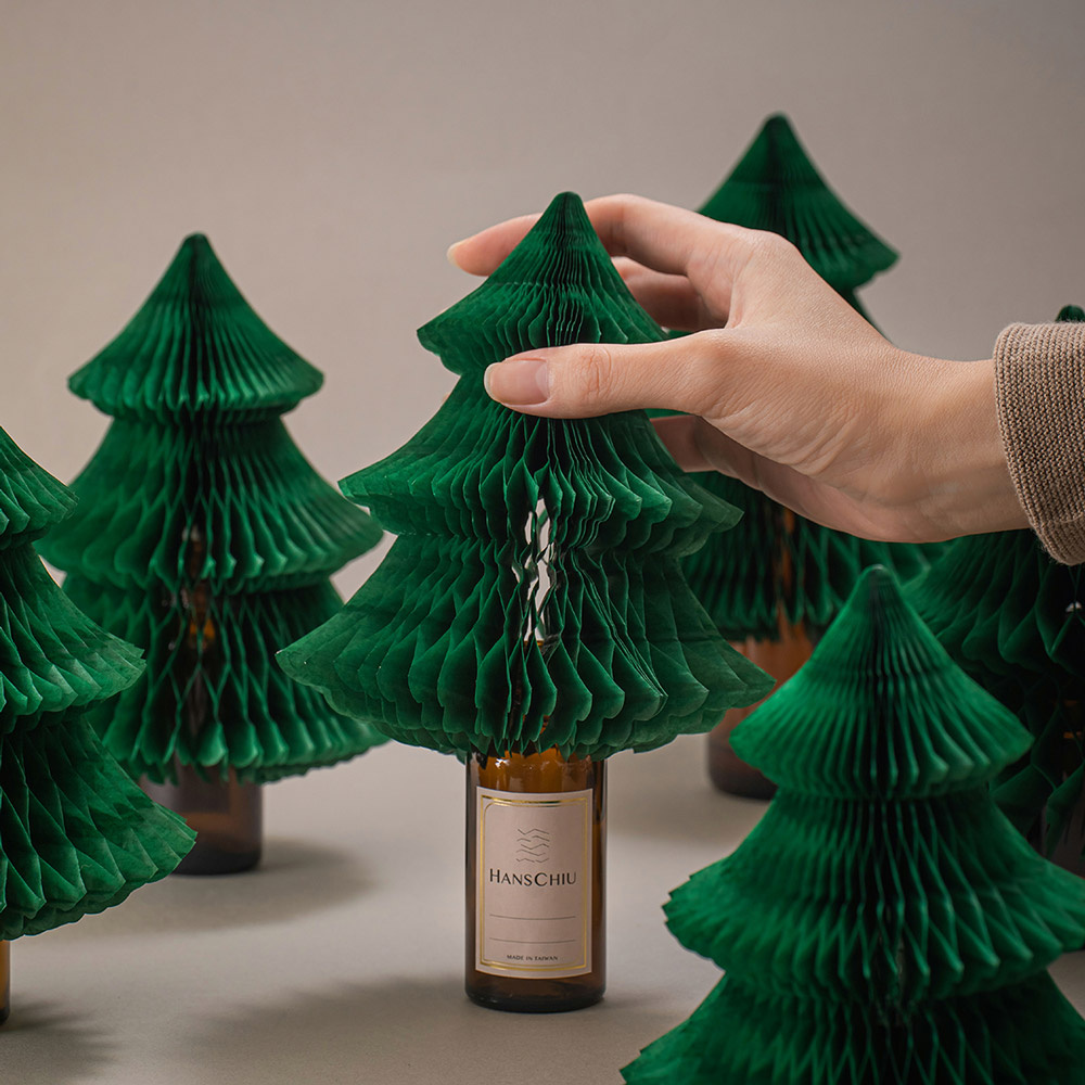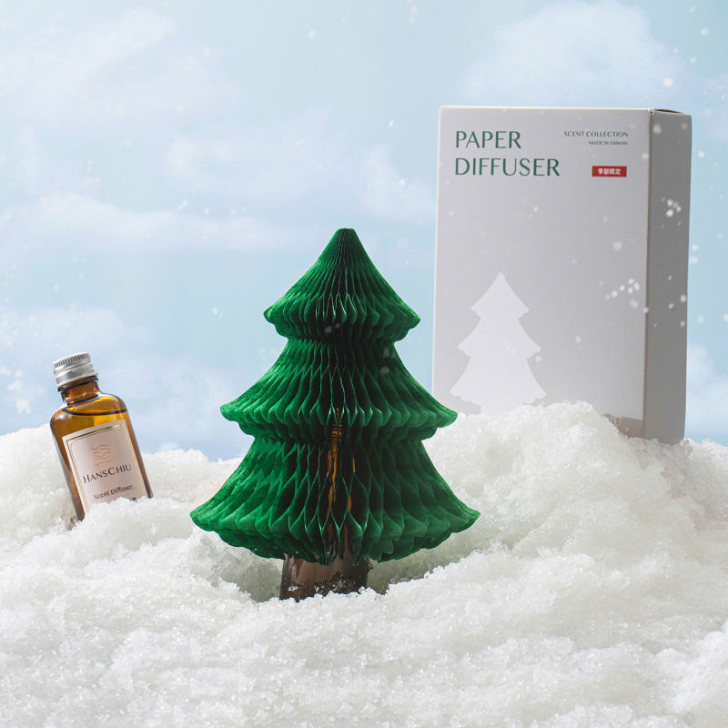 將簍空摺紙與擴香瓶完美結合,搖身變成台灣杉木造型,