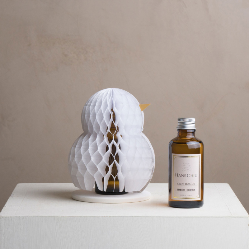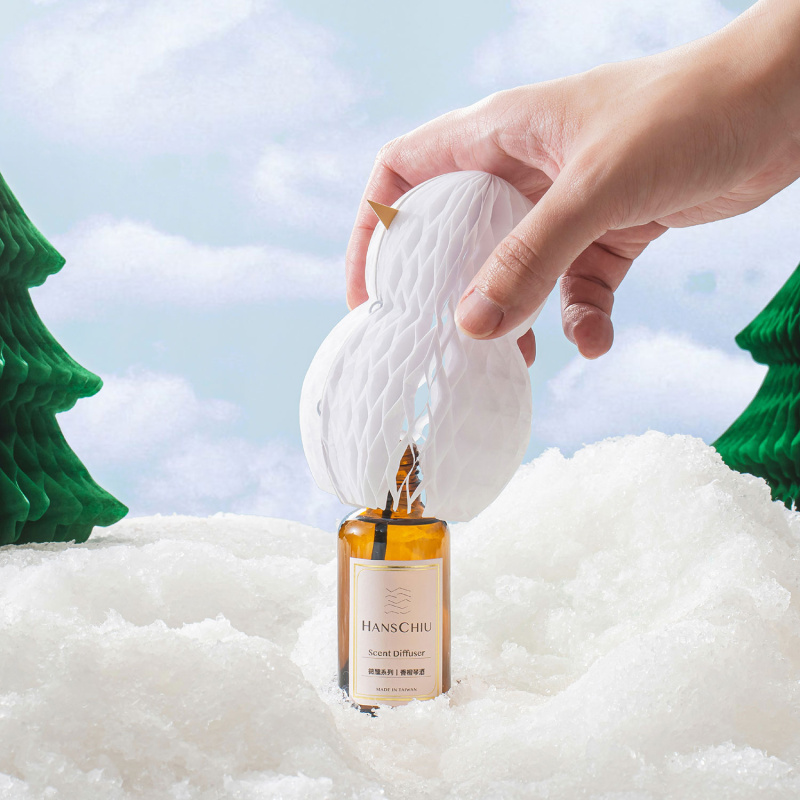 將簍空摺紙與擴香瓶完美結合,搖身變成台灣杉木造型,